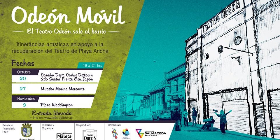Tres escenarios en distintos puntos de Playa Ancha conformarán el “Odeón Móvil”, evento a cargo de la Asociación Teatro Odeón que se desarrollará los días sábado 20 y 27 de octubre, y 3 de noviembre, de 19.00 a 21.00 hrs. Cada fecha contará con una nutrida programación artística gratuita para todo público, orientada a promover el rescate de nuestra memoria histórica y cultural.